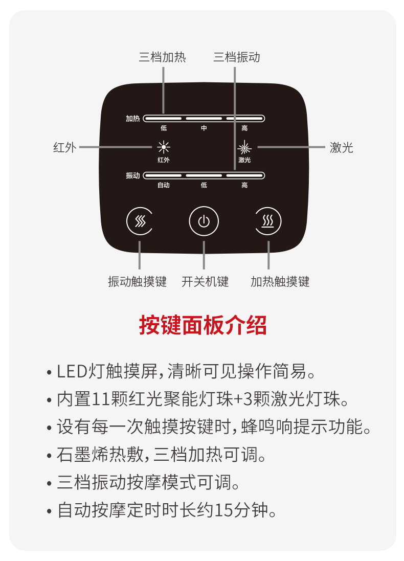 红外激光照射,为膝盖注入活力,11颗红光聚能灯珠和3颗激光灯珠。