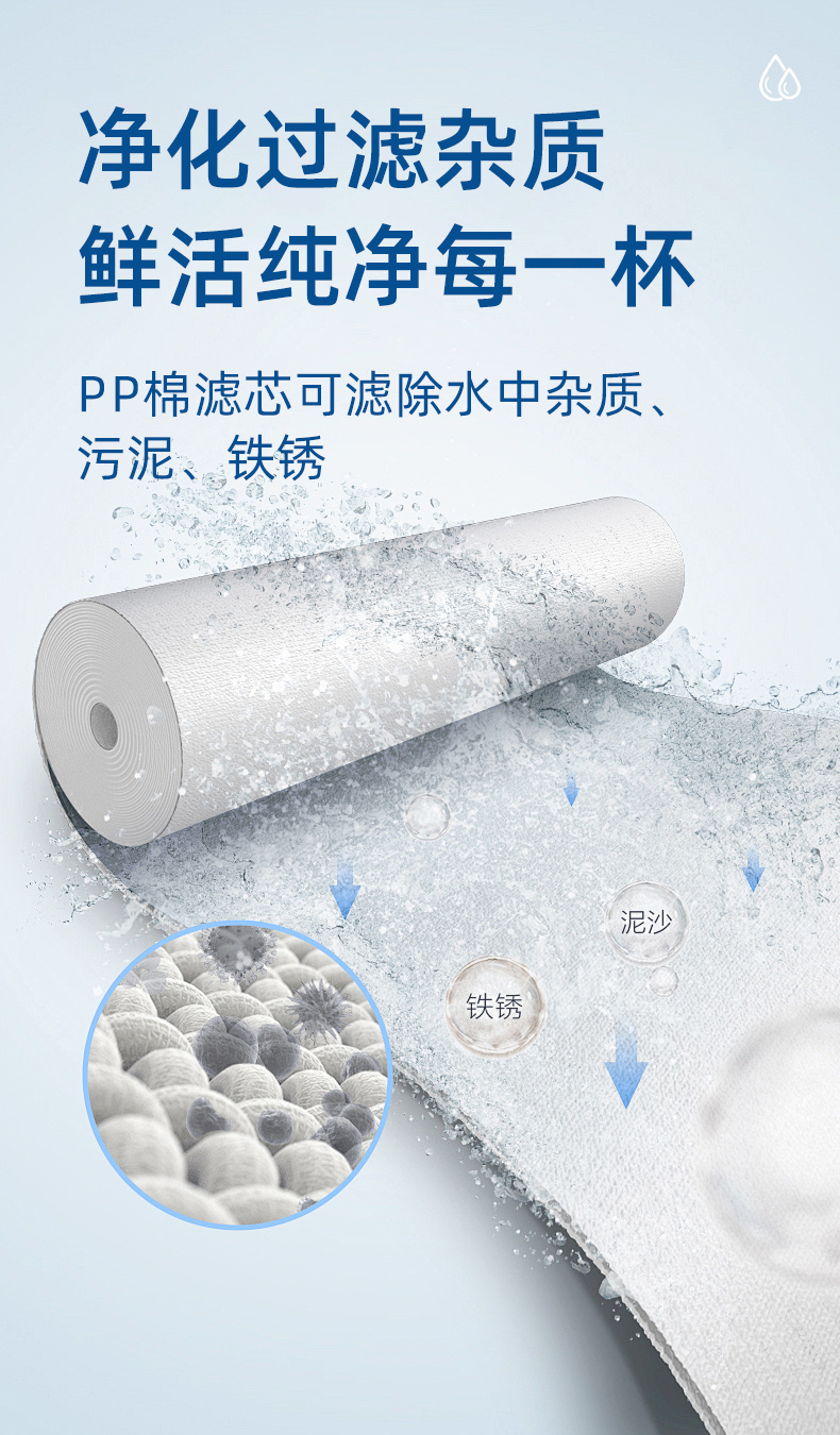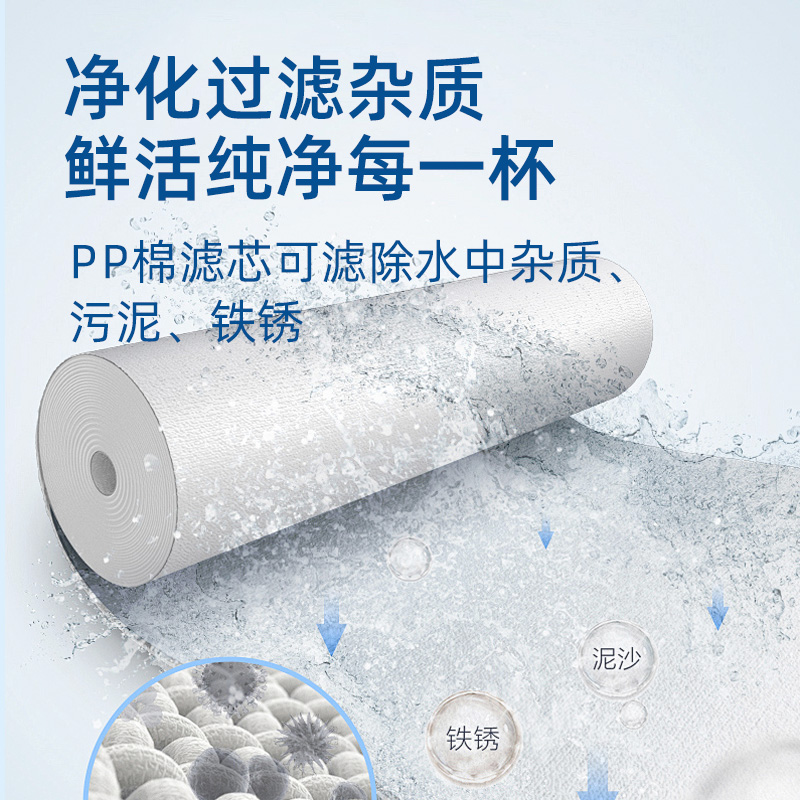 净化过滤杂质,鲜活纯净每一杯。PP棉滤芯可滤除水中杂质、污泥、铁锈
