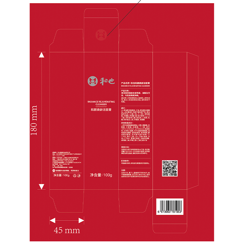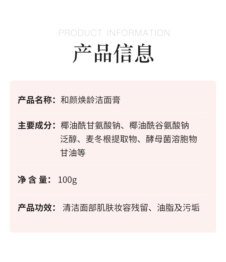 清洁面部肌肤妆容残留、油脂及污垢,令肌肤焕新清爽。净含量(100g)