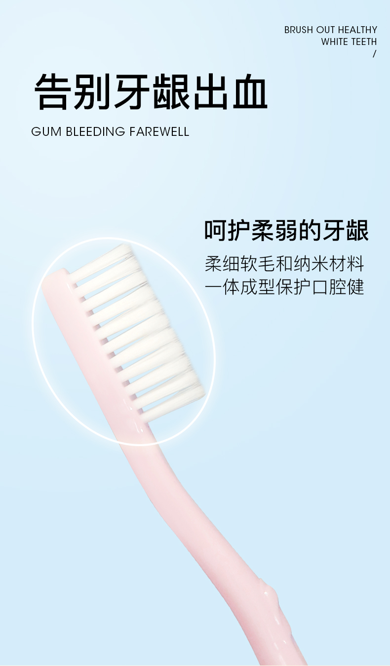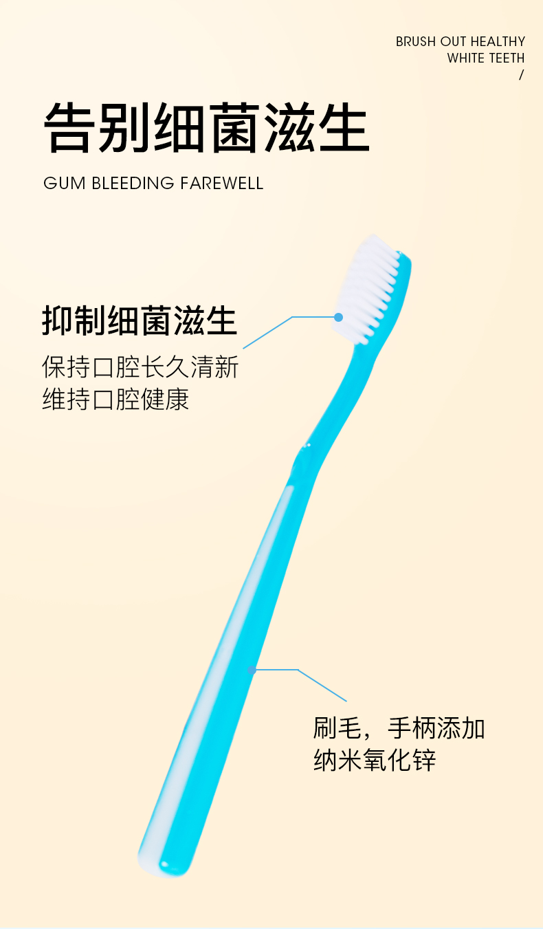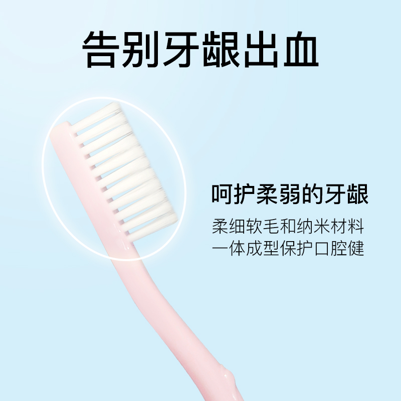 柔细软毛保护牙银,产品采用柔细软毛和纳米材料一体成型。细刷毛深入清洁齿间、牙银沟等口腔细缝:柔软刷毛保护您脆弱的牙根内壁组织。产品在刷毛和手柄上都添加了纳米氧化锌,能有效抑菌,减少牙刷上细菌滋生对口腔造成的危害,缓解炎症,清除口腔异味,使口腔长效持久地保特健康状态。