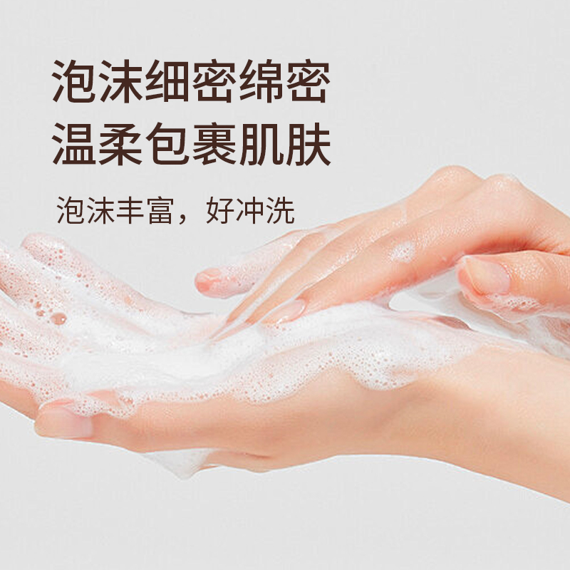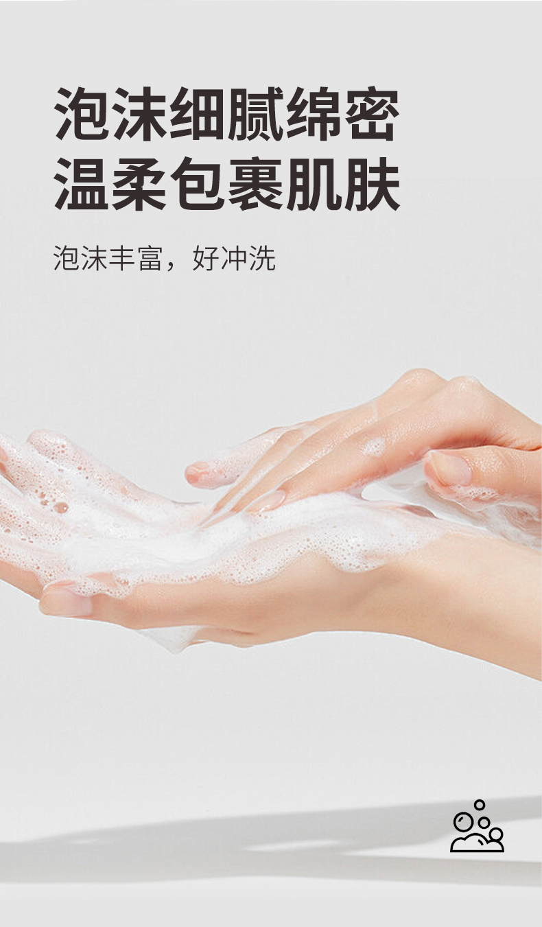 泡沫细腻绵密,温柔包裹肌肤,泡沫丰富,好冲洗
