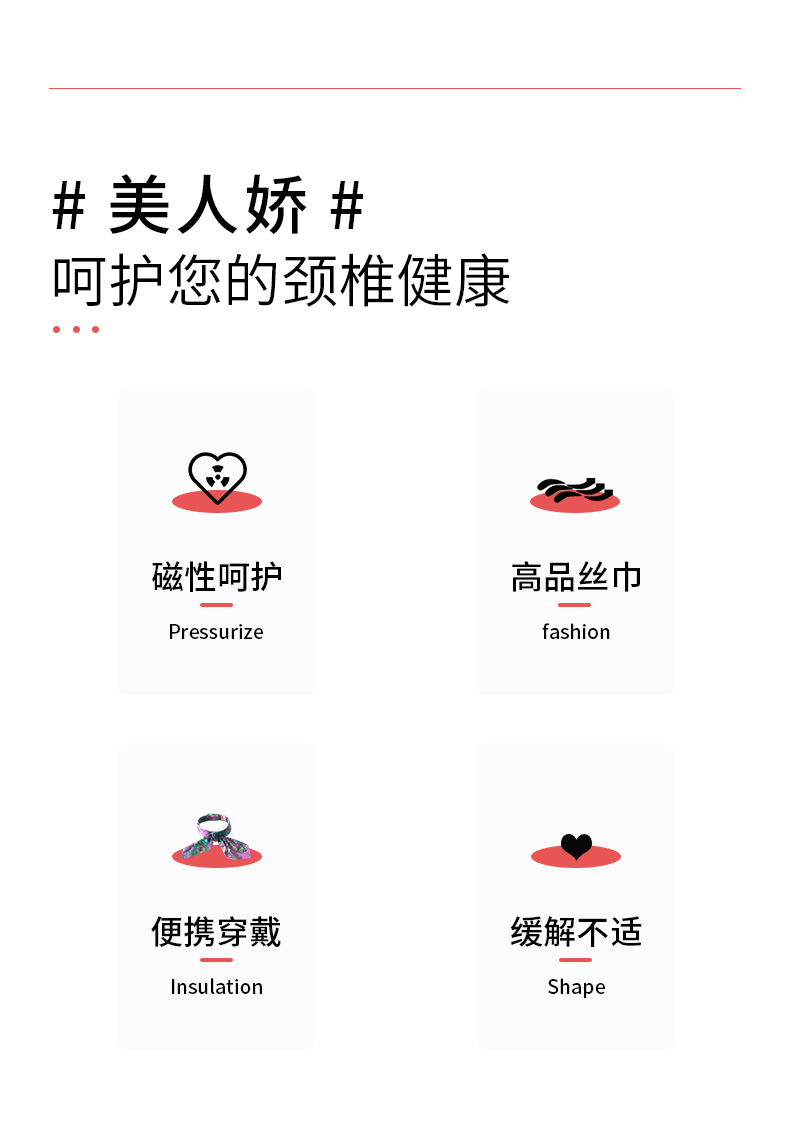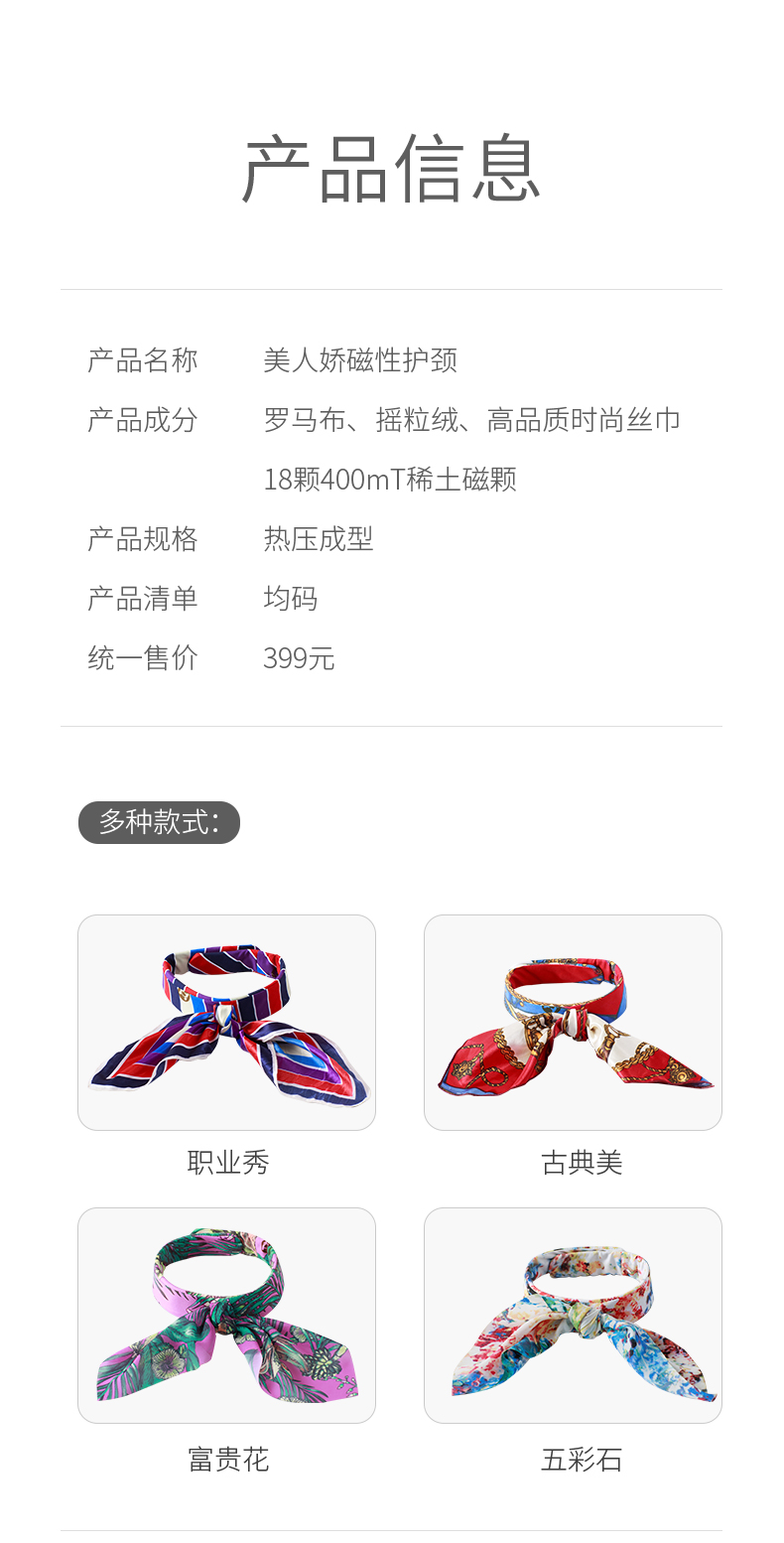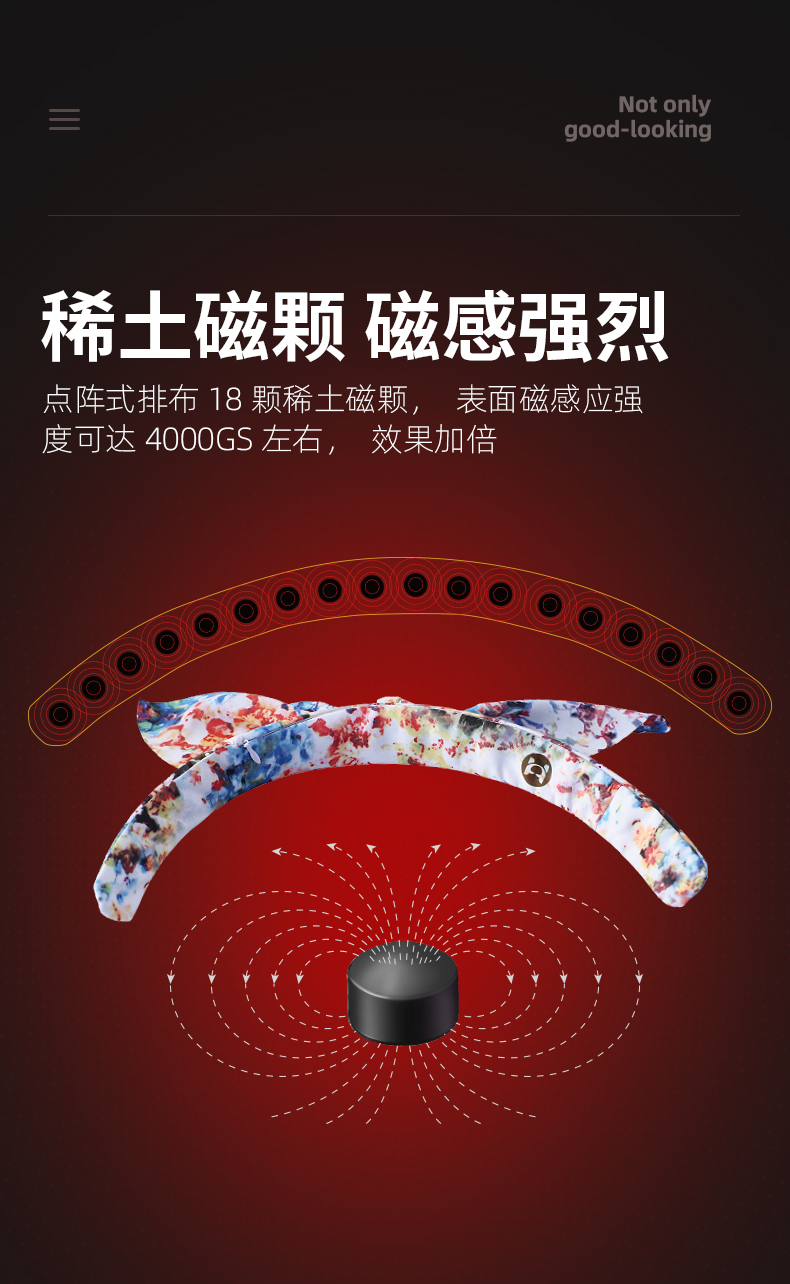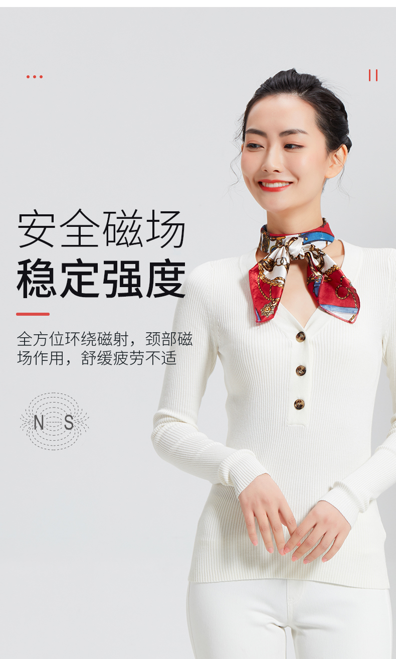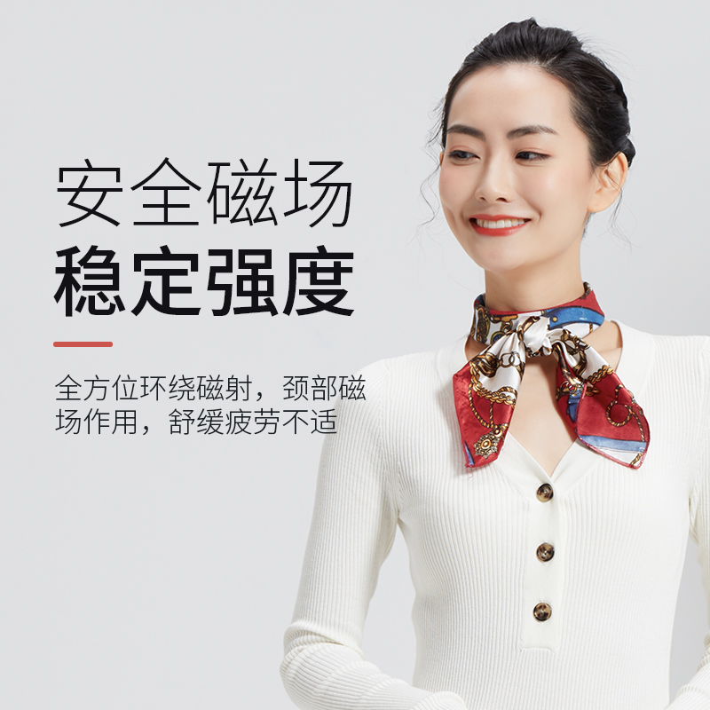 稀土磁颗磁感强烈,点阵式排布18颗稀土磁颗,表面磁感应强度可达400mT左右,效果加倍,360°磁环绕发射磁力线佩戴后作用于颈部,可产生恒定静磁场。