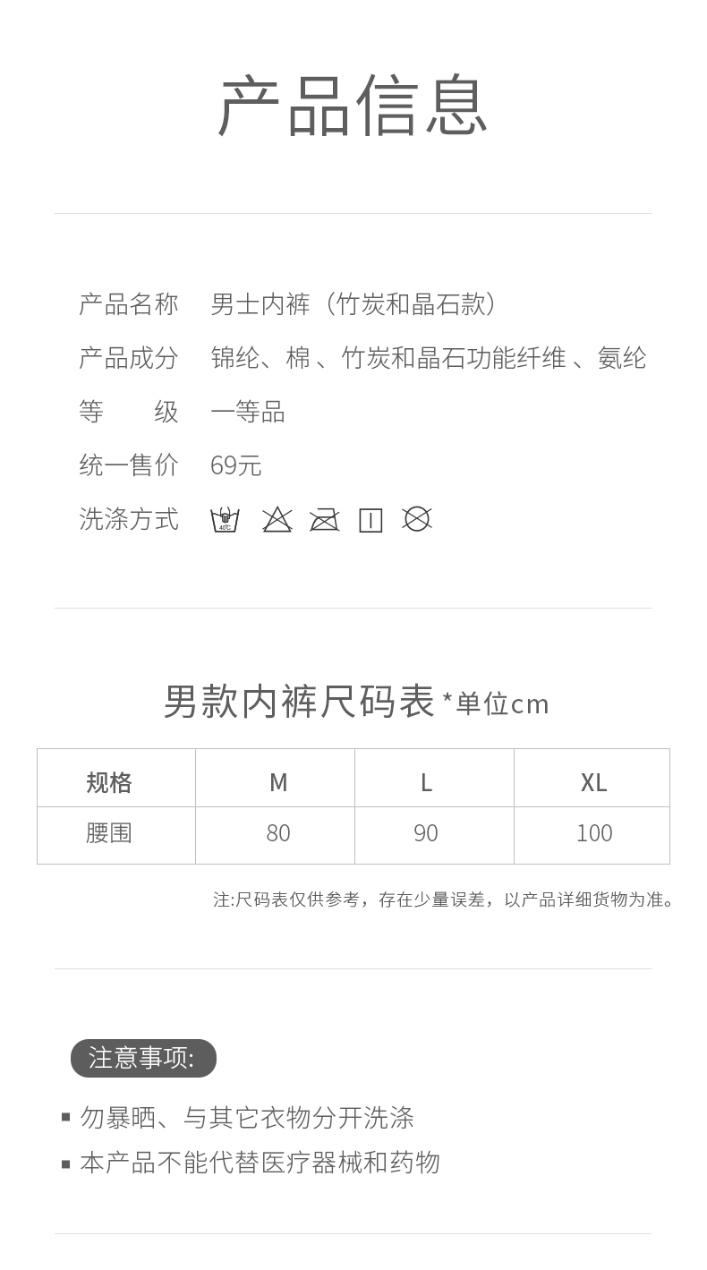 产品由锦纶、棉、炭改性涤纶、氨纶精织而成。产品面料手感柔软、色泽艳丽,让您享受健康、享受贴身呵护。