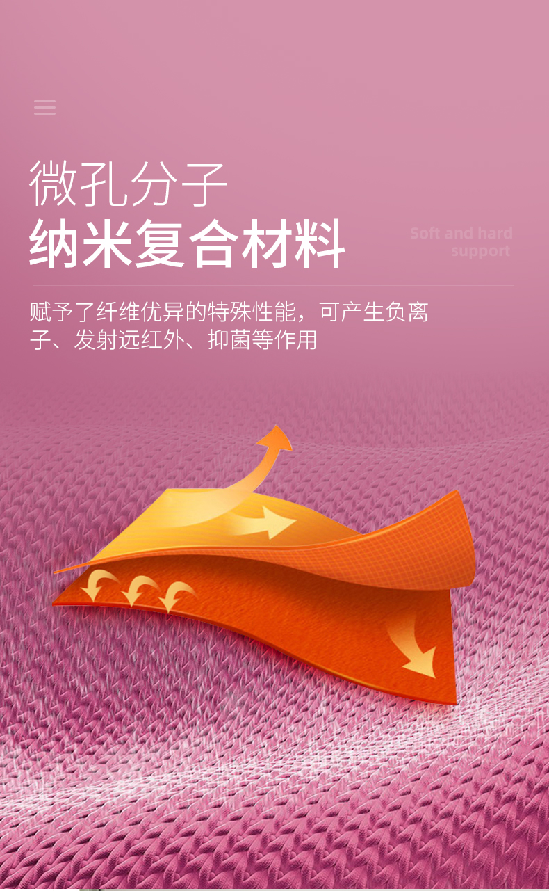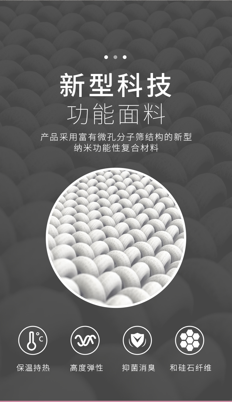 产品采用富有微好孔分子筛结构的新型纳米功性复合材料,赋子了纤维及面料优异的特殊性能,具有负离子、远红外、抑菌等多重功能,让您温暖劲加倍,贴身更贴心!